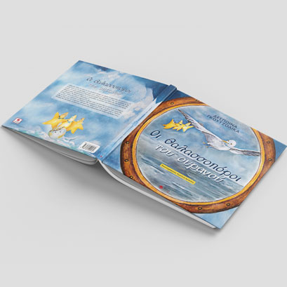 Σχεδιασμός εξωφύλλου για το παραμύθι ”Οι θαλασσοπόροι του ουρανού” της Δέσποινας Γκουτζολίκα. Κυκλοφορεί απο τις εκδόσεις Πνόη.