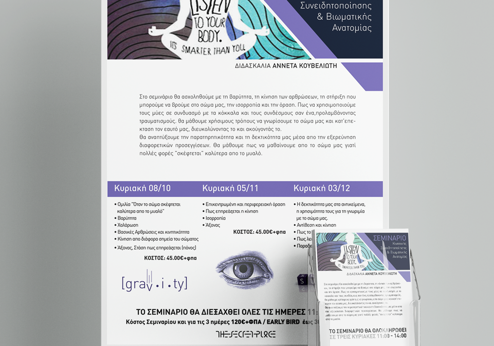 Σχεδιάσαμε και εκτυπώσαμε Poster και Flyers, για το “Σεμινάριο Kινητικής συνειδητοποίησης και βιωματικής ανατομίας” που επιμελείται η Pilates instructor Αννέτα Κουβελιώτη, και θα πραγματοποιηθεί προσεχώς στον χώρο “The Secret Place” στο Μαρούσι.
