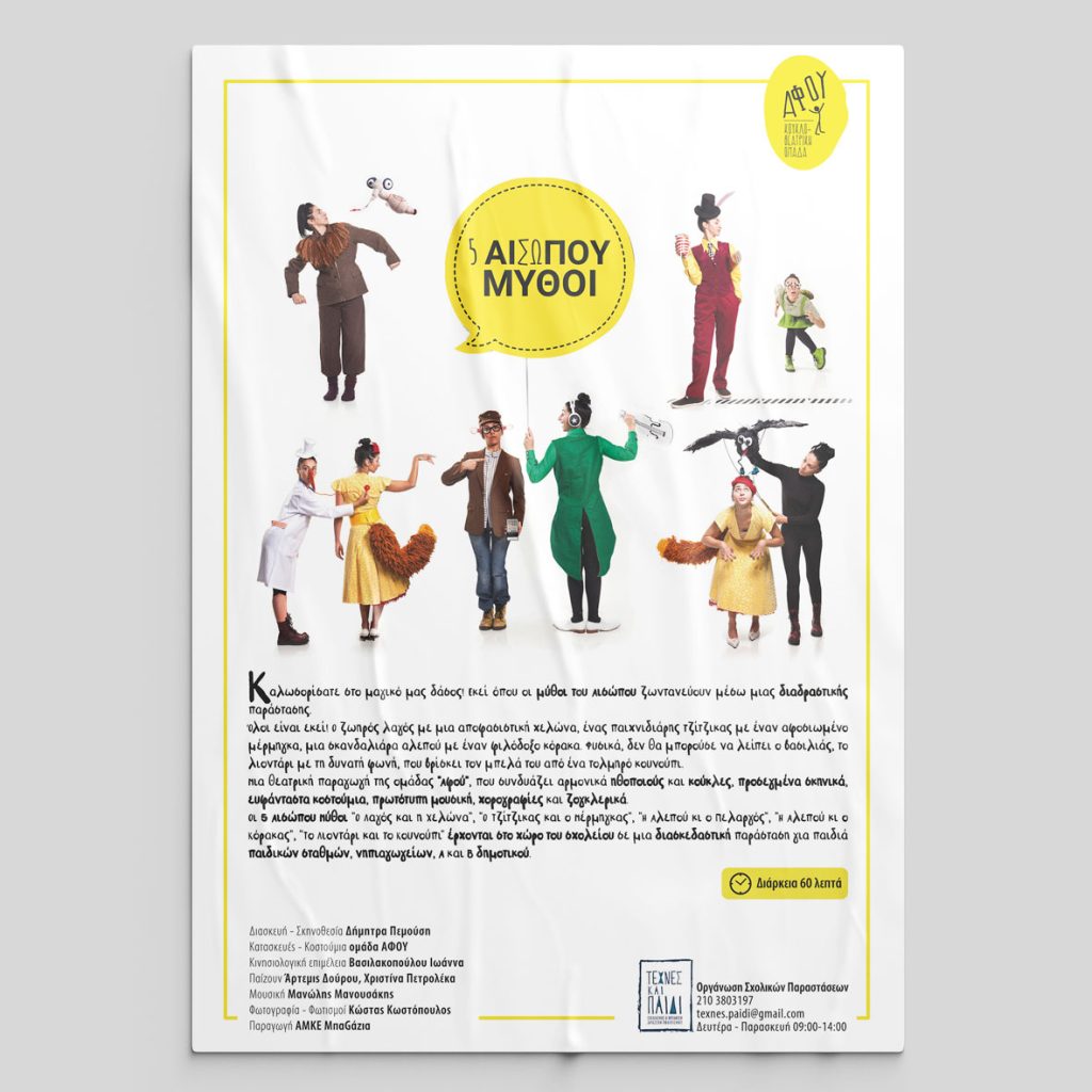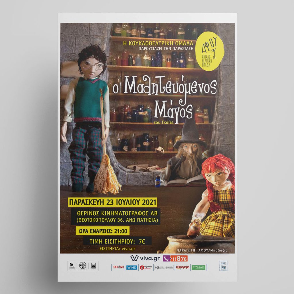 Συνεχίζοντας την συνεργασία μας με την κουκλοθεατρική ομάδα Αφού, σχεδιάσαμε αφίσες δρόμου για 4 διαφορετικές παραστάσεις τους. Ο Μαθητευόμενος Μάγος του Γαίτε , ο Οδοντοχαλάστρας & η Γλυκοσυμμορία του, 5 Αισώπου Μύθοι & για μία πρωτότυπη pop up paper mechanics puppets theater performance για παιδιά με τίτλο Δαίδαλος & Ίκαρος.