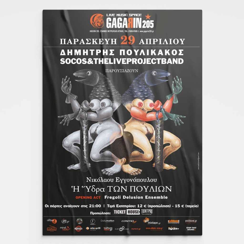 Μαζί στη σκηνή, ο Δημήτρης Πουλικάκος, ο Socos και οι Live Project Band (Μαρία Λατσίνου, Μαρίνος Τζιάρος, Μπάμπης Αντωνάτος, Κυριάκος Βοργιάς , Δημήτρης Αντωνιάδης) παρουσιάζουν το album “Η Ύδρα των Πουλιών”, σε ποίηση Εγγονόπουλου. Ενα μοναδικό live στο Gagarin205, για το οποίο σχεδιάσαμε την αφίσα!